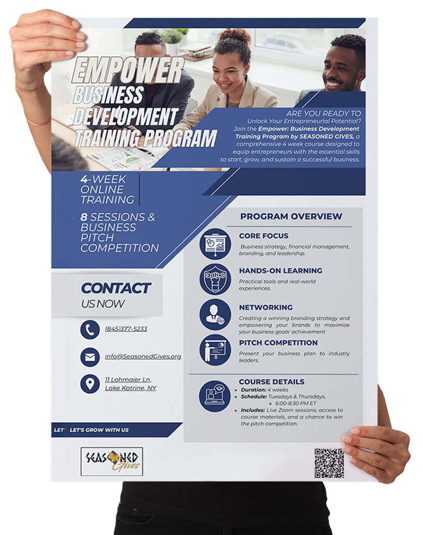 Designed for small business owners and aspiring entrepreneurs, Seasoned Gives' Empower Program equips you with the tools, strategies, and mindset needed to start, scale, and sustain a successful business.