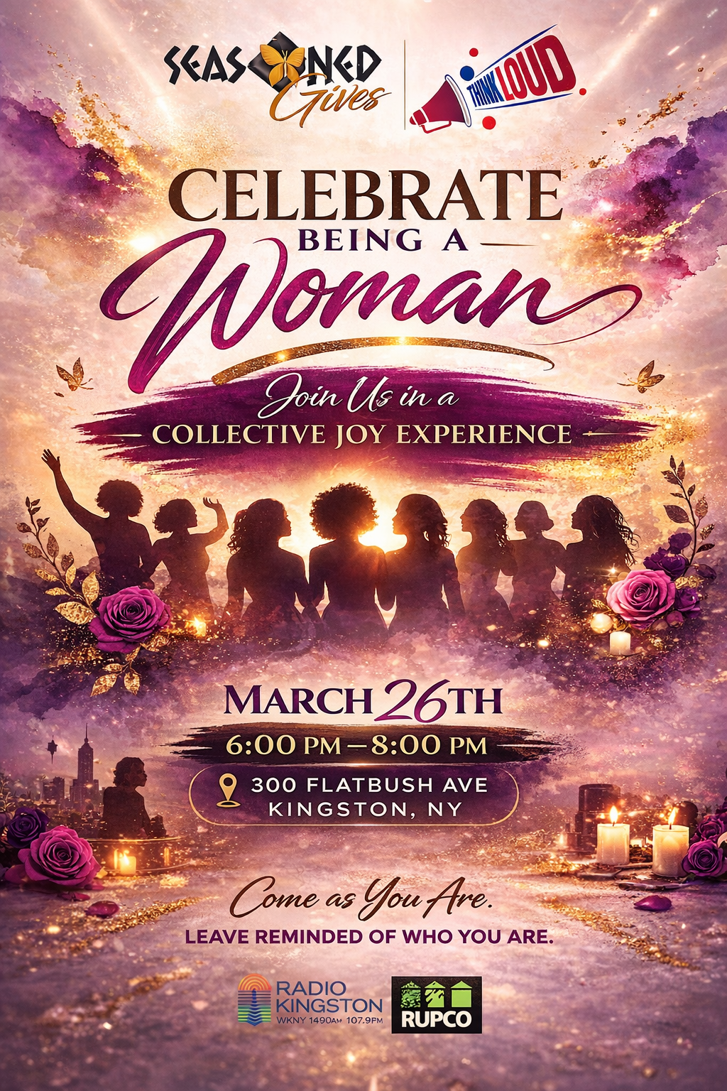 Join Seasoned Gives and LOUD this Women’s History Month for an evening of connection, expression, and celebration on March 26th from 6:00 PM – 8:00 PM at 300 Flatbush Ave in Kingston, NY. This gathering brings women together in a shared space of joy, featuring live singing, dancing, and meaningful moments designed to uplift and inspire.